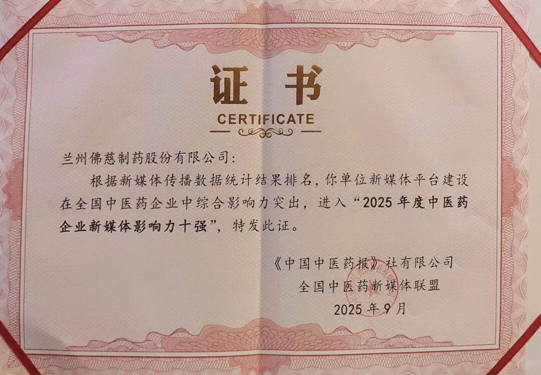 佛慈制药荣登“2025年度中医药企业新媒体影响力十强”
